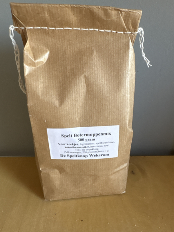 Spelt botermoppenmix met kokosbloesemsuiker om zelf heerlijke koekjes van te bakken (vergelijkbaar met spritskoekje maar dan zonder E-nummers en gezonde/minder suikers) ingrediënten: speltmeel, speltbloem, haver, bakpoeder,…